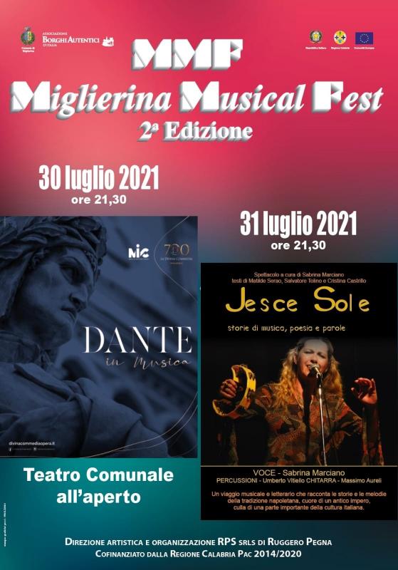 Confermato il “Miglierina Musical Fest 2021”, seconda edizione del nuovo e originale Festival del Musical che si svolgerà i prossimi 30 e 31 luglio nella cornice del Teatro all’Aperto della splendida località turistica calabrese, comune inserito tra i “Borghi autentici d’Italia”, nel Circuito delle 100 mete d’Italia e socio di “Avviso Pubblico - La Rete Nazionale degli Enti Locali Antimafia”. A comunicarlo è il sindaco Pietro Hiram Guzzi che, dopo la sosta dello scorso anno a causa del Covid19, ha deciso di ripartire con l’apprezzato e atteso evento, approvando il nuovo progetto del direttore artistico Ruggero Pegna. Il Festival, organizzato dal Comune di Miglierina e cofinanziato dalla Regione Calabria (Pac 2014/2020 – annualità 2019), si svolgerà ad ingresso libero, nel rispetto di tutte le misure anti contagio in vigore. Ogni serata avrà inizio alle ore 21.30. Di altissimo spessore artistico e culturale il programma di questa edizione, che prevede il 30 luglio lo spettacolo “Dante in musica”, versione concerto dell’Opera Musical La Divina Commedia di Marco Frisina, prodotto dalla Mic con la regia di Andrea Ortis e la partecipazione dei sei attori/cantanti protagonisti principali dell’Opera: Antonello Angiolillo (Dante), Andrea Ortis (Virgilio), Miryam Somma (Beatrice), Noemi Smorra (Francesca /Matilda/Pia), Antonio Sorrentino (Pier/Arnaut), Antonio Melissa (Ugolino/Catone /Caronte/S.Antonio).