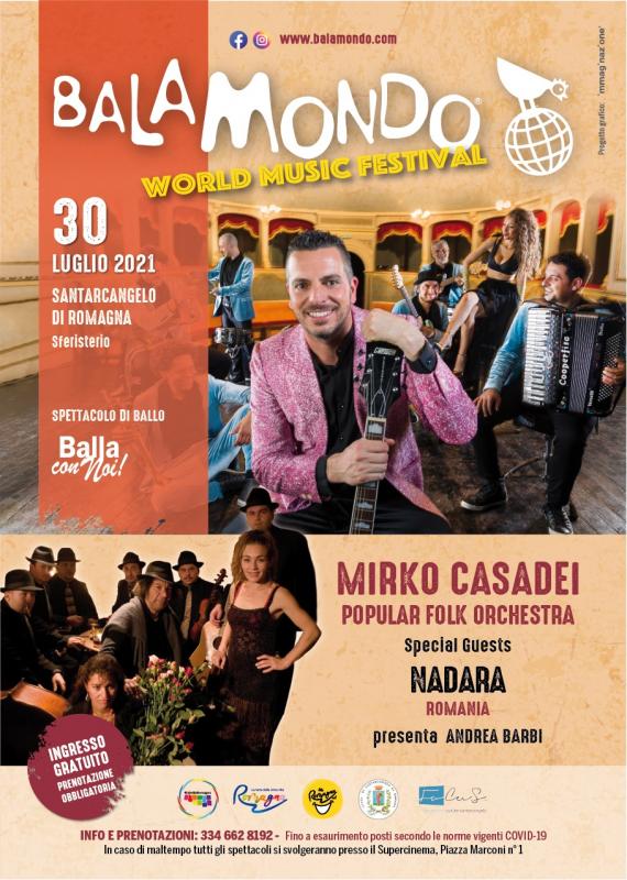 Balamondo World Music è il festival diretto da Mirko Casadei legato a musica, ballo, territori, che mette al centro la musica popolare e il ballo tipico della terra romagnola avvalendosi della presenza di grandi ospiti. Questa edizione – dedicata a Raoul Casadei a pochi mesi dalla sua scomparsa – vedrà Mirko Casadei e gli artisti ospiti presenti proporre i brani storici del Re del Liscio rivisitati per l’occasione.