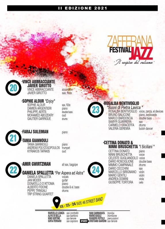 Il 23 luglio ROSALBA BENTIVOGLIO, con il suo quintetto e la danzatrice butoh Valeria Geremia, presenta “Suoni di Pietra Lavica”, sua produzione originale per Zafferana Jazz Festival, mentre il 24 luglio sul palco dell'Anfiteatro andrà in scena la prima nazionale assoluta de “I Siciliani”, album scritto a quattro mani dalla pianista messinese CETTINA DONATO e dall’attore NINNI BRUSCHETTA.