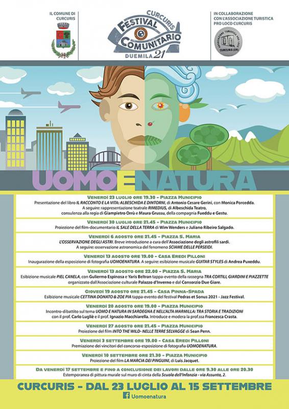 Da venerdì 23 luglio e fino al 15 settembre a Curcuris (Or) si terrà la prima edizione del festival comunitario “Uomo e Natura”, fortemente voluto dall’amministrazione comunale e dal sindaco Raffaele Pilloni, con l’obiettivo di accrescere la coesione sociale attraverso mirate azioni culturali che, in questa prima edizione, propongono un’ampia ed eterogenea riflessione sui vari profili del rapporto tra uomo e natura.