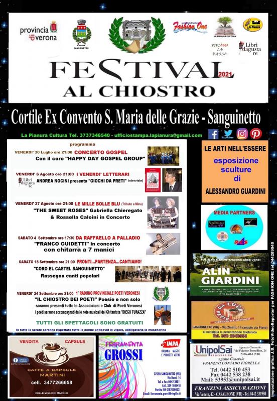 Ritorna dopo 3 anni presso il chiostro dell'Ex convento di S. Maria delle Grazie di Sanguinetto il FESIVAL AL CHIOSTRO evento con il patrocinio della Provincia di Verona e il Comune di Sanguinetto organizzato dalla Associazione Culturale La Pianura con i rami "Pianura Cultura" e l' agenzia moda e spettacolo "Fashion One" .