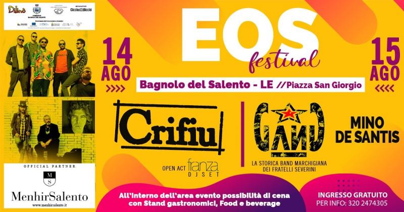 Gang, Crifiu, Mino De Santis e Franza sono gli ospiti della prima edizione di Eos Festival che si terrà sabato 14 e domenica 15 agosto alle 21:30 in Piazza San Giorgio a Bagnolo del Salento.