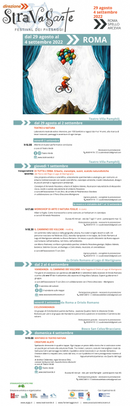in collaborazione con: Ass. Ti con Zero, Biblioteca della Bicicletta Lucos Cozza, Parco Regionale Bracciano/Martignano, I Tesori Naturali, Tetes de Bois, Teatro Biblioteca del Quarticciolo, Teatro Tor Bella Monaca, Ministero della Cultura, Regione Umbria, Regione Marche, Comune di Spello, Comune di Arcevia, Roma Capitale - Assessorato all'Agricoltura, Ambiente e Ciclo dei rifiuti, Umbria sistema Parchi, Parco Regionale Gola della Rossa, Alte Marche Creative, Amat.