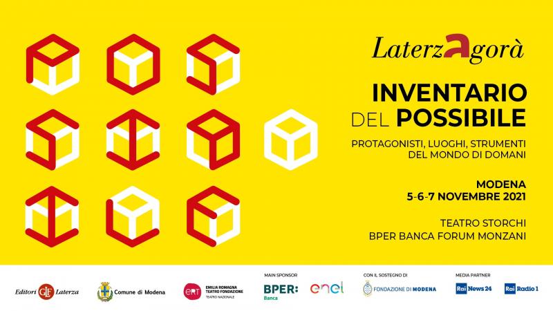 Dal 5 al 7 novembre 2021 al Teatro Storchi e al BPER Banca Forum Monzani di Modena si terrà la seconda edizione di “Laterza Agorà”, un festival del pensiero ideato dagli Editori Laterza, prodotto da ERT / Teatro Nazionale e Comune di Modena, con il supporto di BPER Banca e Enel, main sponsor dell’iniziativa, e con il contributo della Fondazione di Modena. Media partner: Rai News24 e Rai Radio1.