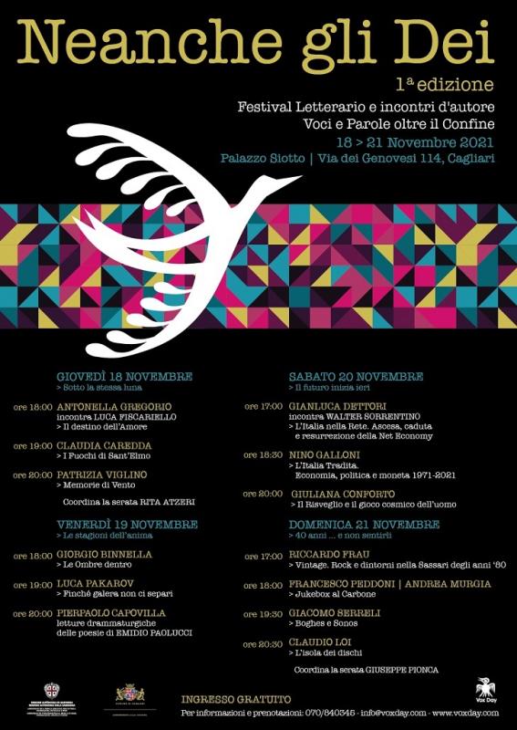 Tutto pronto, a Cagliari, per il debutto di Neanche gli Dei, il festival letterario e di incontri che da giovedì 18 novembre a domenica 21 vivrà la sua prima edizione al Palazzo Siotto, al civico 114 di via dei Genovesi, nel cuore del quartiere storico di Castello. Ideazione e organizzazione sono della cooperativa Vox Day, sodalizio "storico" nel panorama della musica in Sardegna, che espande così il raggio della sua attività culturale: «Con questa iniziativa - spiegano gli organizzatori – inauguriamo un nuovo spazio dedicato a quei contenuti che fino a oggi abbiamo proposto solo parzialmente nei programmi del Karel Music Expo, il "festival delle culture resistenti" che organizziamo da quindici anni; un nuovo spazio dove proporre occasioni di confronto dialettico e interazione tra linguaggi affini».