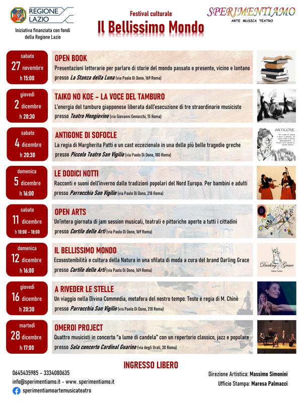 Prende il via dal 27 novembre al 28 dicembre “Il Bellissimo Mondo”, rassegna dedicata alla musica e al teatro, con concerti, spettacoli e performance, ideata e realizzata dall’ “Associazione Culturale Sperimentiamo Arte Musica Teatro” con la direzione artistica dello scrittore Massimo Simonini.