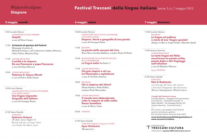 Ideato dalla Fondazione Treccani Cultura, da venerdì 5 a domenica 7 maggio torna a Lecce “#leparolevalgono. Festival Treccani della lingua italiana”. Un appuntamento annuale pensato per presentare i temi più rilevanti della costante ricerca di Treccani sulla lingua italiana. Un ricco programma di laboratori didattici, lezioni magistrali, incontri tematici e spettacoli musicali, che stimoleranno la riflessione su tematiche (clima, letteratura, poesia, web, lingua, storia, arte, economia, filosofia, religione) in grado di coinvolgere il pubblico e gli esperti in un dialogo di sincero, rispettoso e costruttivo confronto tra diverse posizioni. Dedicata alla parola stupore, questa sesta edizione del Festival, si svolgerà per la prima volta in tre tappe. Dopo Lecce, infatti, il festival approderà a Roma (27/28 maggio – 9/11 giugno) per poi concludersi a Lecco (21/24 settembre).