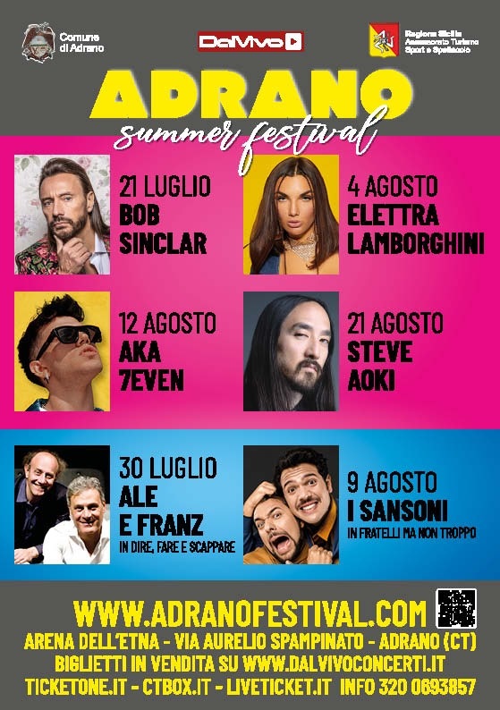 Nasce ADRANO SUMMER FEST, la prima edizione si svolgerà dal 8 luglio al 11 settembre 2022 all’interno della splendida Arena dell’Etna di Adrano (CT), inaugurata quest’anno, Un cartellone ricco di eventi, prodotto dall’associazione Fandango Entertainment, tra djset, musica, teatro, opera: due appuntamenti internazionali con le uniche date in Sicilia per BOB SINCLAR (21 luglio), una vera leggenda della musica dance con una carriera ultraventennale costellata da hit mondiali e centinaia di dischi di platino e oro, e STEVE AOKI (21 agosto) disc jockey e produttore discografico statunitense di origini giapponesi, noto anche come l'artista musicale più quotato del Nord America.