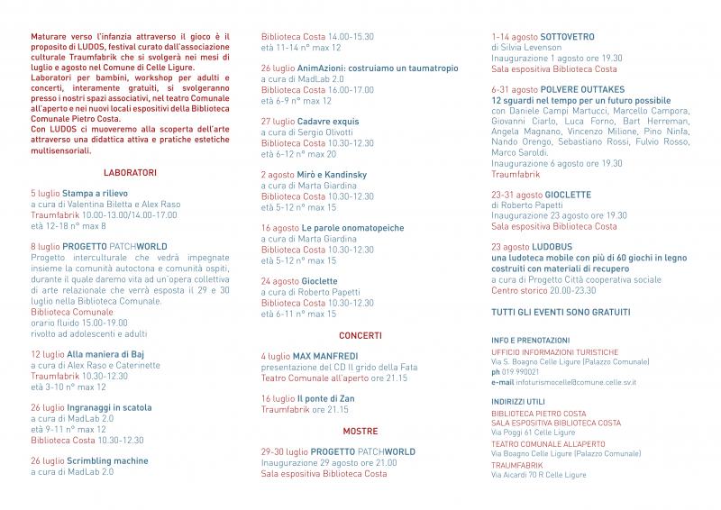 Maturare verso l'infanzia attraverso il gioco è il proposito di LUDOS, festival curato dall'associazione culturale Traumfabrik che si svolgerà nei mesi di luglio e agosto nel Comune di Celle Ligure.