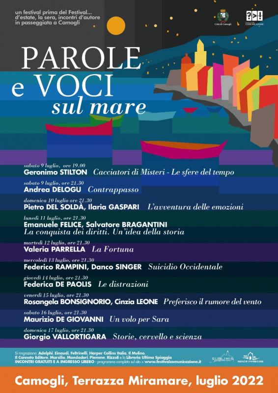 Giunta alla sua seconda edizione dopo il successo dell’esordio nell’estate 2021, Parole e voci sul mare è la rassegna delle serate d’autore organizzata da Frame - Festival della Comunicazione e dall’Assessorato alla cultura del Comune di Camogli, in collaborazione con le case editrici Adelphi, Einaudi, Feltrinelli, HarperCollins, Il Canneto Editore, Il Mulino, Marsilio, Mondadori, Piemme, Rizzoli e la libreria Ultima Spiaggia.