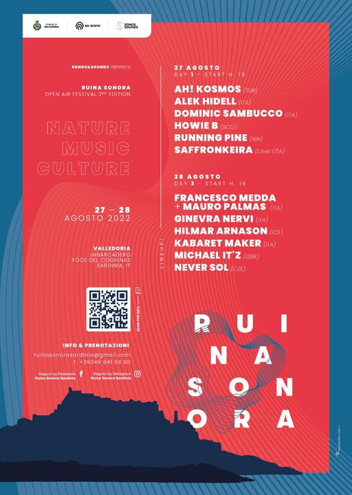 Fervono i preparativi per la seconda edizione del Festival Ruina Sonora che si terrà a Valledoria nei pressi della Foce del Coghinas il 27 e 28 agosto. Saranno due giornate intense, durante le quali si avvicenderanno sul palco ben 12 artisti provenienti da 8 paesi diversi, ognuno dei quali offrirà agli spettatori un’esperienza avvolgente, guidandoli attraverso un percorso sensoriale che toccherà vari generi musicali. L’elettronica sarà senza dubbio il punto di partenza del festival in un itinerario che si snoderà attraverso ambient, folk, dub, trip-hop, passando per cinematic, downbeat, afro, balearic e nu-disco.