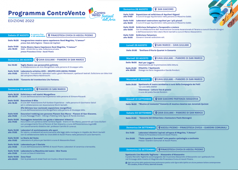 Incontri, escursioni, spettacoli, reading poetici, voli in mongolfiera, laboratori, gare di aquiloni, eventi gastronomici, passeggiate botaniche, teatro, mercatini, concerti, dimostrazioni sportive all’aria aperta e molto altro ancora…È un programma denso di iniziative quello che caratterizza la 2° edizione di Controvento – Festival dell’Aria, la rassegna in scena fino a domenica 4 settembre 2022 nelle Marche, tra Colle San Marco, Pianoro di San Giacomo e il centro storico di Ascoli Piceno.