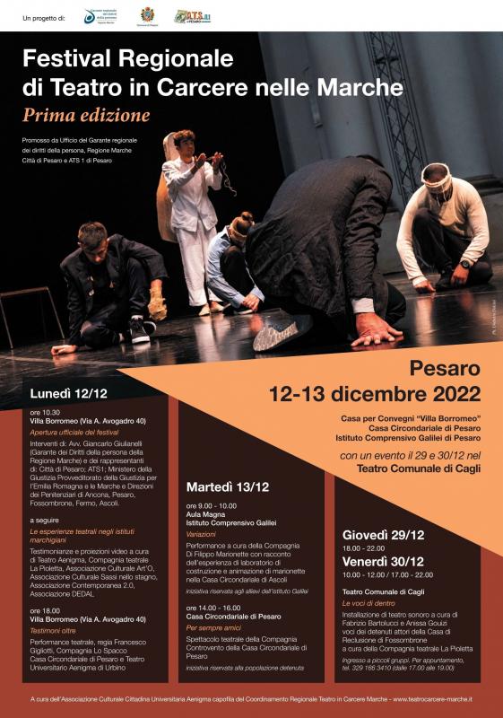 A Pesaro, lunedì 12 e martedì 13 dicembre, il primo festival Regionale di Teatro in Carcere, un progetto dell’Ufficio del Garante dei diritti della persona della Regione Marche e della Città di Pesaro con l’Ambito Territoriale Sociale 1, a cura dell’Associazione Culturale Cittadina Universitaria Aenigma capofila del Coordinamento Regionale Teatro in Carcere Marche.