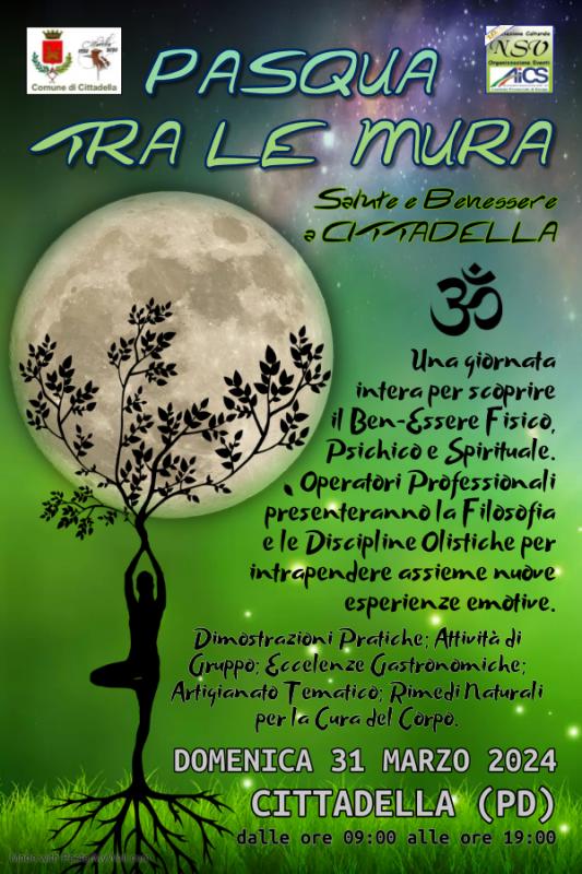 L'Associazione Culturale NSV Organizzazione Eventi APS affiliata A.I.C.S. - Comitato Provinciale di Rovigo, promuove ed organizza la Manifestazione "Pasqua tra le Mura - Salute e Benessere a Cittadella" che si svolgerà Domenica 31 Marzo 2024 a Cittadella (PD), dalle ore 09:00 alle ore 19:00.Una giornata intera per scoprire il Ben-Essere Fisico, Psichico, Spirituale ed Emozionale. Operatori Professionali e Creativi presenteranno la Filosofia e le Discipline Olistiche per intraprendere assieme nuove esperienze emotive.Dimostrazioni Pratiche; Attività di Gruppo; Corsi; Trattamenti individuali; Laboratori; Eccellenze EnoGastronomiche; Artigianato Artistico; Rimedi Naturali per la Cura del Corpo.Saranno presenti Punti Ristoro con Somministrazione di Alimenti e Bevande.Truccabimbi, Animazioni ed Intrattenimenti vari faranno da cornice alla giornata.