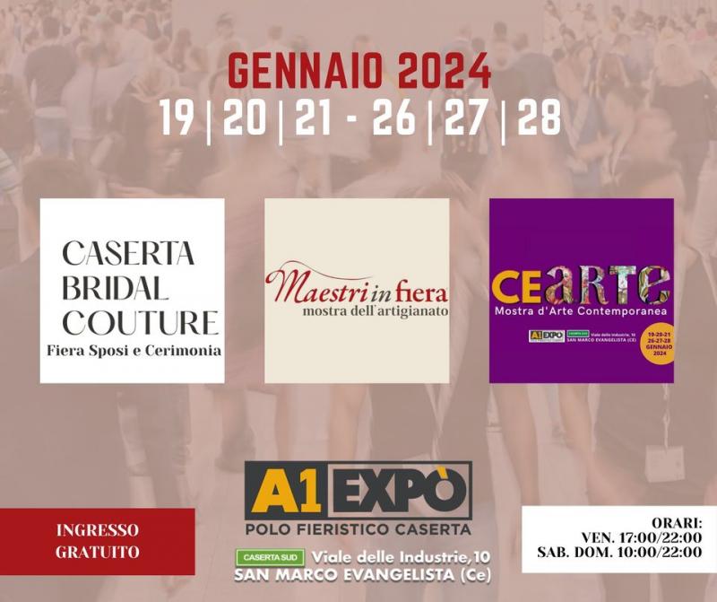 Da venerdì 19 a domenica 21 e per il fine settimana successivo, da venerdì 26 a domenica 28 gennaio 2024, a San Marco Evangelista, in Viale delle Industrie 10, si terrà Caserta Bridal Couture, la fiera dedicata ai futuri sposi, coadiuvata con Maestri in Fiera, Mostra dell'Artigianato, e CeArte, Mostra dell’Arte Contemporanea.