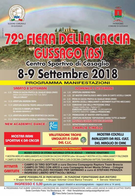 Come ogni anno torna Sabato 08 e Domenica 09 Settembre 2018 la Fiera Della Caccia Di Gussago, un appuntamento inserito nell'Autunno Gussaghese, occasione per conoscere il mondo della caccia e della natura.