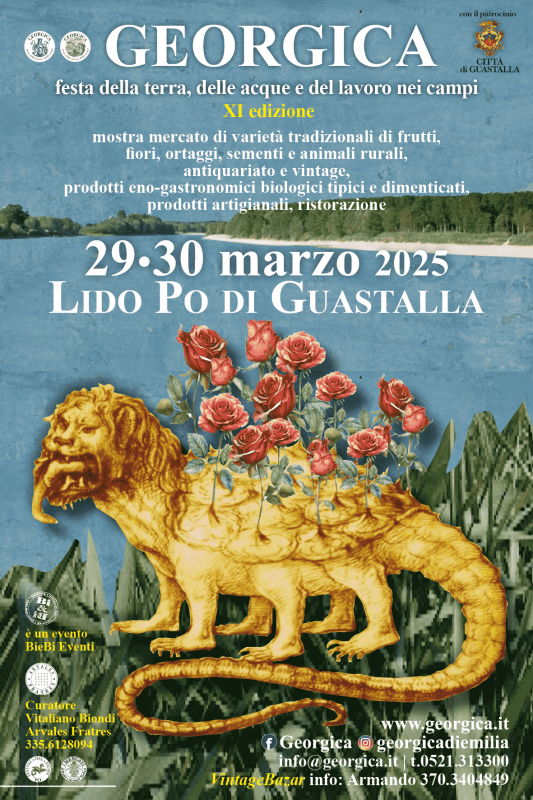 Per chi ama stare all’aria aperta e godere di un paesaggio fluviale dalla bellezza sorprendente. Per chi intende praticare un turismo di qualità e sostenibile, legato alla ricerca di autenticità e di scoperta delle culture dei territori. Per chi ama il verde, per chi vuole conoscere il buon cibo e avvicinare la sapienza di un tempo il 29 e 30 marzo 2025 nel Lido Po a Guastalla, a pochi chilometri da Reggio Emilia, Parma e Mantova, si rinnova l'appuntamento con Georgica. Festa della terra, delle acque e del lavoro nei campi (Ingresso 5 euro. Bambini e ragazzi fino ai 14 anni, persone con disabilità ed accompagnatori ingresso libero. Info: www.georgica.it – info@georgica.it).