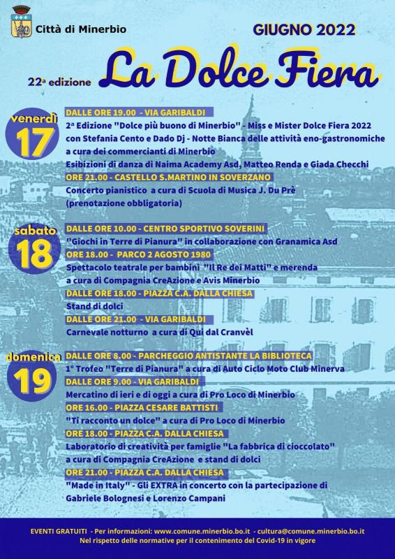 Torna la 22° edizione de "La Dolce Fiera", la tradizionale manifestazione che vede la città protagonista di una tre giorni di eventi culturali, ricreativi e di gastronomia. Ecco il programma delle iniziative: