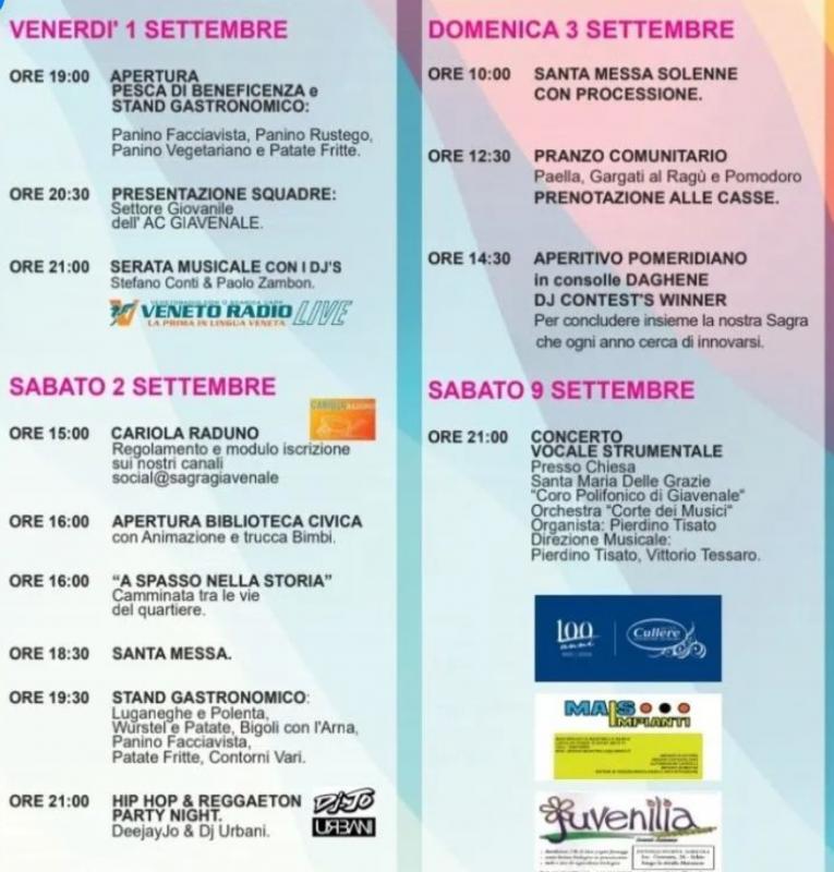 la Sagra Giavenale si svolge Il 1-2-3 Settembre 2023 a Giavenale di Schio (VI), zona Campo Sportivo: Via Maddalena 20, si svolge la Sagra Giavenale.