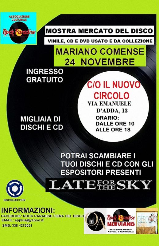 Vi aspettiamo, Domenica 24 Novembre a Mariano Comense, Mostra Mercato del Disco e CD per hobbisti, presso il Nuovo Circolo Mariano situato in Via Emanuele D’Addda 13, Manifestazione organizzata dall’Associazione Culturale Rock Paradise,da Operazione Artisti, Discollection e dal Nuovo Circolo Mariano.
