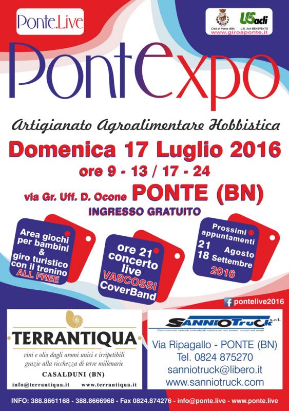 I giorni 20 e 21 agosto p.v. l’Associazione PONTE.LIVE, con il patrocinio del Comune di Ponte (BN), organizzerà la quarta edizione della fiera mensile “PONTEXPO – Artigianato Agroalimentare Hobbistica“. L’evento, con ingresso gratuito, si svilupperà questa volta in viale Stazione e avrà lo scopo di promuovere le eccellenze enogastronomiche locali.