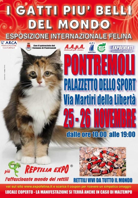 I GATTI PIU' BELLI DEL MONDO si possono ammirare all'Esposizione Internazionale Felina che si svolge a PONTREMOLI (MS) dove gatti di razza provenienti da tutta Europa si contenderanno il titolo per l'assegnazione di "gatto più bello del mondo" presso il Palazzetto dello Sport (Via Martiri della Libertà) nelle giornate di sabato 25 e domenica 26 Novembre.Dalle ore 10 alle ore 19 sia del sabato che della domenica i visitatori potranno ammirare i campioni mondiali di tante razze feline che verranno giudicati dai Giudici Internazionali WCF (World Cats Federation) nel Best in Show in programma al pomeriggio di entrambe le giornate ove verrà decretato il " gatto più bello del mondo".