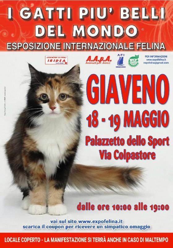 A GIAVENO (TO) presso il Palazzetto dello Sport "PalaGiaveno" di Via Colpastore nei giorni di sabato 18 e domenica 19 Maggio, orario dalle ore 10 alle ore 19, si svolgerà la grande Esposizione Internazionale Felina de "I GATTI PIU' BELLI DEL MONDO" con la partecipazione di tanti gatti di razza che, sotto l'egida dell'Associazione Felina Italiana A.F.I., verranno giudicati da Giudici Internazionali WCF (World Cats Federation) nel Best in Show in programma al pomeriggio di entrambe le giornate.