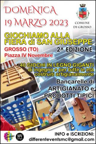Grosso (TO) Domenica 19 Marzo, in Piazza IV Novembre dalle 09.00 alle 18.00 torna Giochiamo, l’evento più creativo e intelligente. Tra bancarelle di artigianato e prodotti tipici vi aspettiamo per scervellarvi con noi con oltre 40 giochi giganti di ingegno manuale e mentale costruiti artigianalmente in legno . 2a edizione.