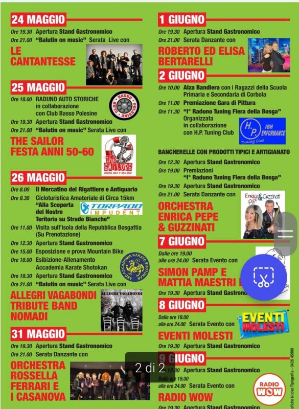 Presso il Porticciolo Balutìn a Corbola in provincia di Rovigo si svolge nei giorni dal 24 al 26 Maggio , dal 31 Maggio al " Giugno e dal 7 al 9 Giugno 2024 la 18a edizione della Fiera della Bosga.