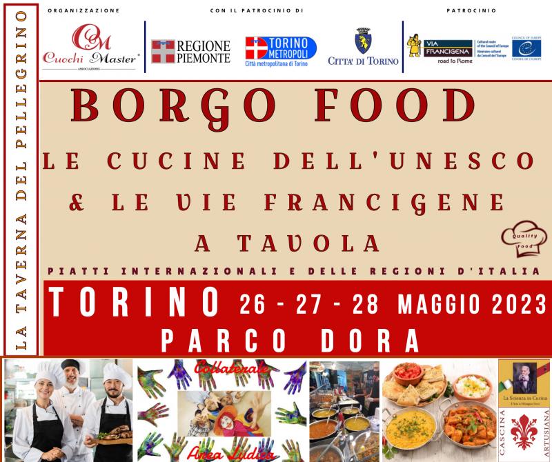 Sarà Torino ad accogliere l’ 8ª tappa del Tour Nazionale (Limited Edition) “Borgo Food 2023” Le Cucine che l’Unesco ha riconosciuto patrimonio dell’Umanità & Le Vie Francigene a Tavola, manifestazione di Cultural Quality Food, organizzata dall’Associazione Cuochi Master. La manifestazione si svolgerà nella splendida cornice del Parco Dora, inizierà venerdì 26 maggio alle ore 15.00, per proseguire fino a domenica 28 maggio 2023 dalle ore 09,00 alle ore 24,00. Il progetto vuole essere un percorso del gusto e non solo, dove verranno presentati piatti internazionali riconosciuti dall’Unesco Patrimonio Immateriale dell’Umanità e le specialità regionali nel percorso delle Vie Francigene. Nel ricco palinsesto, verrà anche trasmesso, attraverso un maxi schermo, il meritevole messaggio culturale del sapere sull’immateriale Unesco, ne citiamo alcuni: Opera dei Pupi siciliani, Canto a tenore sardo, Saper fare liutario di Cremona, Falconeria, Perdonanza Celestiana ecc..