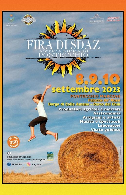 La Fira di Sdaz, antica festa della tradizione contadina, ritorna puntale a Pontecchio Marconi (BO) nella suggestiva cornice del cinquecentesco Palazzo de’ Rossi che, per l'occasione, si animerà di artigiani, artisti, cantastorie, bancarelle con oggetti per la cantina e per il giardino, prodotti tipici, dolciumi e curiosità. Con i suoi tre secoli di storia, la Fìra conserva intatto un fascino che ci riporta indietro nel tempo, alle tradizioni popolari e alle origini contadine della nostra gente.