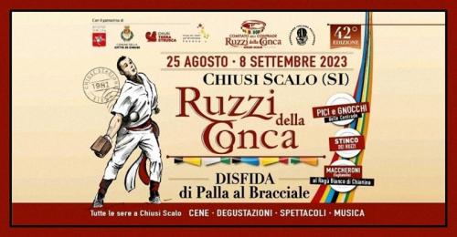 Da Venerdì 25 Agosto a Domenica 03 Settembre, compresi, le strade di Chiusi Scalo si riempiranno dei colori delle contrade. Nel programma dei Ruzzi della Conca 2023 non solo la disfida di palla al bracciale, sia maschile, che femminile, ma anche i “ruzzini”, gli spettacoli degli sbandieratori e tamburini, lo speluzzico e il ristorante, aperto tutte le sere con menù in continuo aggiornamento. A fare da cornice a tutte le serate “Il Bagno 81-La Conca”, aperto fino a tardi ad allietare lo stomaco di chi rimarrà a ballare o ad ascoltare gli ospiti del main stage.