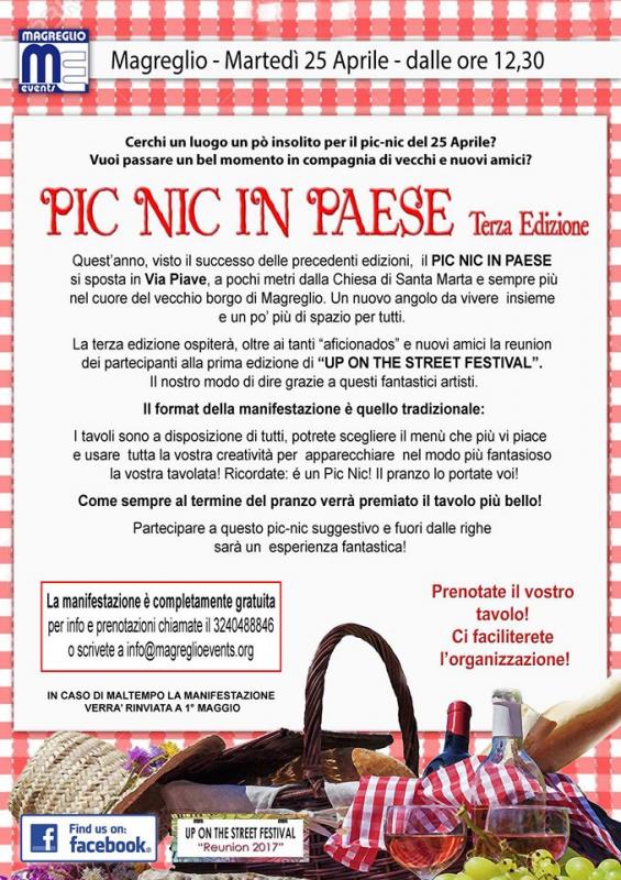 Quest’anno, visto il successo delle precedenti edizioni, il PIC NIC IN PAESE si sposta in Via Piave, a pochi metri dalla Chiesa di Santa Marta e sempre più nel cuore del vecchio borgo di Magreglio.Un nuovo angolo da vivere insieme e un po’ più di spazio per tutti.La terza edizione ospiterà, oltre ai tanti “aficionados” e nuovi amici la reunion dei partecipanti alla prima edizione di “UP ON THE STREET FESTIVAL”. Il nostro modo di dire grazie a questi fantastici artisti.Il format della manifestazione è quello tradizionale:I tavoli sono a disposizione di tutti, potrete scegliere il menù che più vi piace e usare tutta la vostra creatività per apparecchiare nel modo più fantasioso la vostra tavolata!...