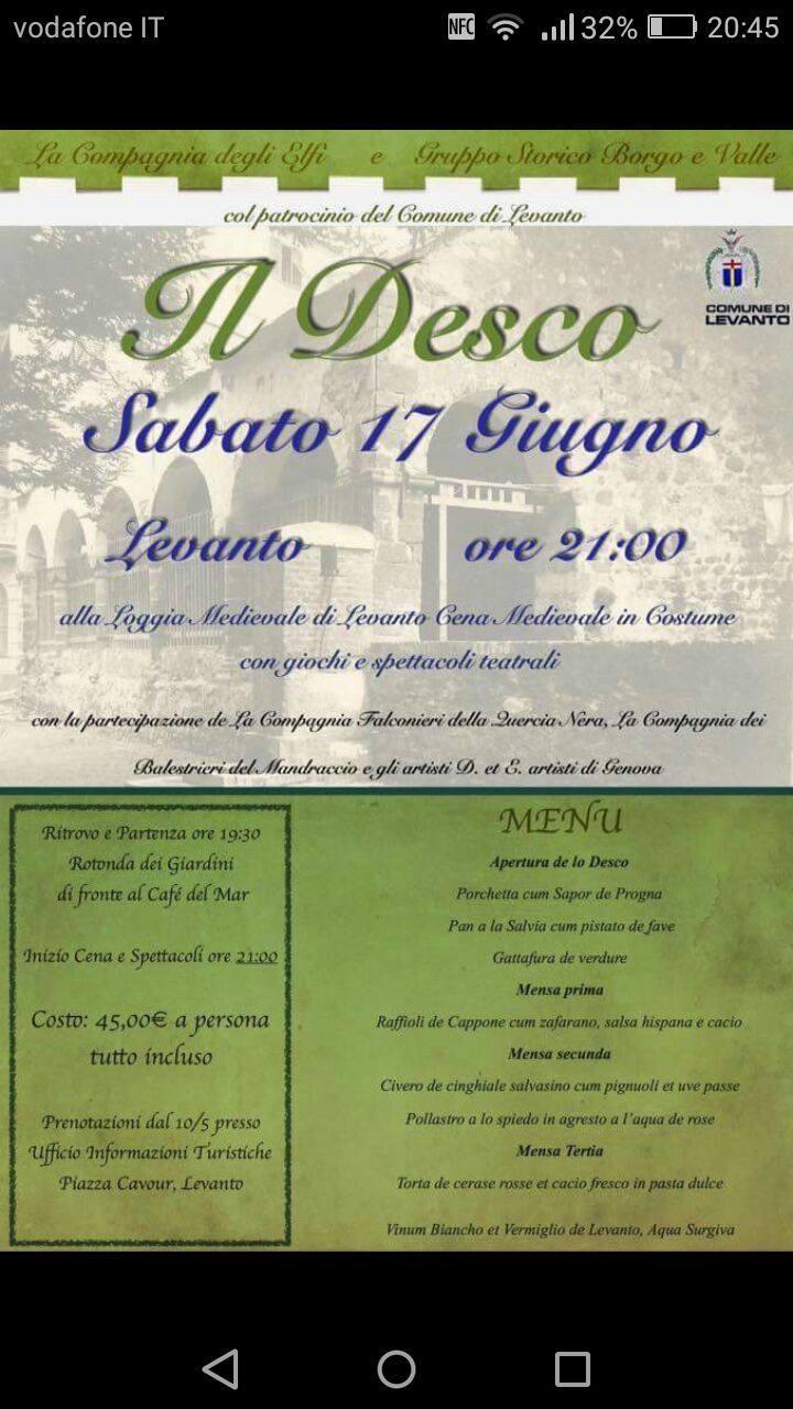 La seconda edizione del evento della associazione "Compagnia Degli Elfi di Levanto" dove tutti partecipanti saranno vestiti nei abiti medioevali forniti prima della cena.