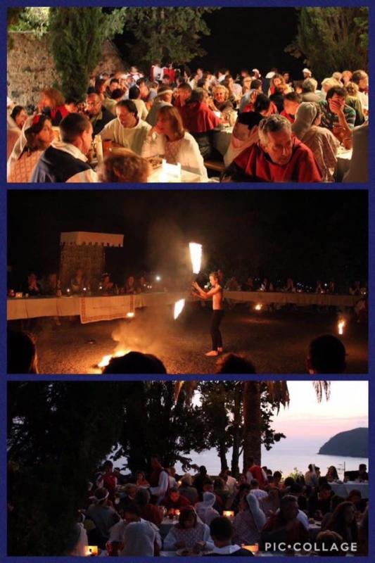 Un evento nei costumi medioevale con spettacoli dei falconieri, Balestrieri,mangia fuoco, sbandieratori e spettacolo medioevale, battaglia e tutto questo davanti li occhi cenando all'aperto nella Loggia Medioevale