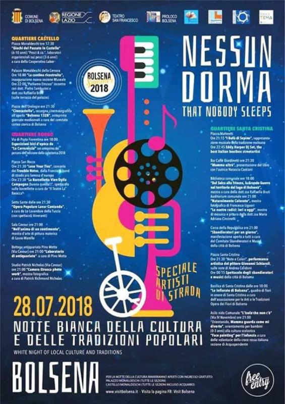Torna a Bolsena, nell’ambito di Bolsena Summer 2018, la Notte Bianca della Cultura e delle tradizioni popolari, in programma nella cittadina lacustre sabato 28 luglio e organizzata dal Comune in collaborazione con Regione Lazio, Teatro San Francesco e Pro Loco Bolsena.