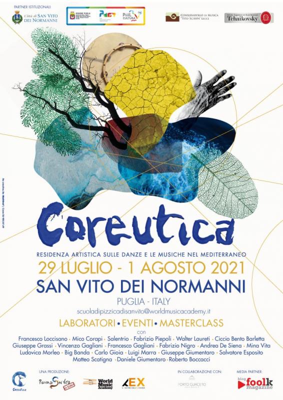 Coreutica - Residenza artistica sulle musiche e le danze nel Mediterraneo, giunta quest’anno alla settima edizione, è un progetto nato nel 2015 a San Vito dei Normanni. La cittadina del brindisino, infatti, vanta una tradizione unica nel suo genere e ospita oggi numerose realtà in cui la tradizione e la musica sono fenomeni che generano azioni importanti sia a livello comunitario sia artistico. Punti di riferimento della residenza sono il Laboratorio Urbano ExFadda e Tex - il Teatro dell’ExFadda, luoghi in cui le due realtà promotrici della residenza sviluppano nuove strategie culturali sul territorio, sperimentano metodi di inclusione e formazione di comunità intorno ai temi del teatro, della musica e della danza. A questi si aggiunge la splendida location di Porto Guaceto agribeach. Il programma di questa edizione riassume gli intenti e le sperimentazioni fino ad ora operati dai promotori e dagli ospiti intorno alla danza di matrice tradizionale e alla world music, cercando di tendere lo sguardo in avanti. Nel corso delle scorse edizioni Coreutica si è confermata una delle iniziative di carattere internazionale più significative dell’estate salentina per partecipazione e condivisione, pronta a proiettare il patrimonio sanvitese in un interessante dialogo con il patrimonio immateriale del resto del Mediterraneo e con i nuovi linguaggi della danza e della musica contemporanee.