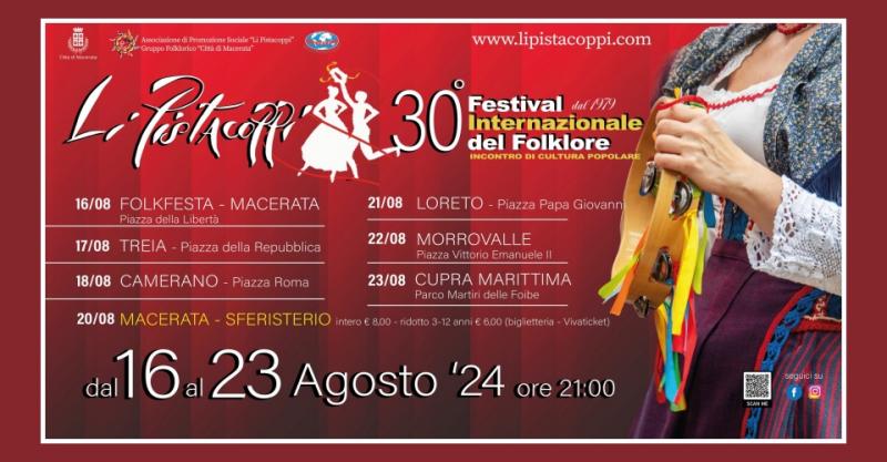 In questa 30a edizione potrete ammirare il folklore di diversi gruppi provenienti da tutto il mondo come: Ecuador, Nuova Zelanda, Sud Africa e Sardegna, che si esibiranno in diverse piazze della Regione Marche! Saliremo sul palco anche noi de "Li Pistacoppi" con danze del folklore marchigiano e maceratese.