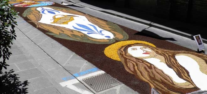 Assistere all’Infiorata rappresenta una buona occasione anche per scoprire le bellezze di Città della Pieve, dove meritano una vista la chiesa di Santa Maria dei Bianchi con l’affresco raffigurante “L'adorazione dei Magi”, la Cattedrale dei Santi Gervasio e Protasio, la Rocca e Palazzo della Corgna. Appena fuori le mura sorge l’antica chiesa di S.Francesco, risalente dal XII Secolo, che conserva la famosa tavola del Pomarancio “La Pentecoste”: da settantadue anni la chiesa è divenuta il primo santuario italiano dedicato alla Madonna di Fatima, e nell'oratorio adiacente è conservato l'affresco “La Crocefissione di Gesù” di Jacopo di Mino detto “Il Pellicciaio”. Nell’ottobre del 2015, inoltre, nel territorio comunale è stata scoperta una meravigliosa tomba etrusca: datata tra la fine del IV sec. a.C. e gli inizi del III sec. a.C., la Tomba di Laris - com’è popolarmente definita per via del nome del proprietario scolpito sul sarcofago principale - è costituita da una camera sepolcrale completamente scavata nel terreno argilloso a cui si accede tramite un lungo corridoio di 12 metri; al suo interno sono stati rinvenuti, insieme agli oggetti di corredo, due grandi sarcofagi monumentali in arenaria e travertino e tre urne cinerarie in marmo alabastrino sui cui coperchi sono scolpiti i defunti a banchetto, conservati presso il Museo Civico-Diocesano di Santa Maria dei Servi. Ma è tutta Città della Pieve, adagiata a 500 metri di altezza su un colle che domina la Val di Chiana e il Trasimeno, a conservare tesori di grande valore a partire dalle opere del suo figlio più illustre, Pietro Vannucci detto Il Perugino.