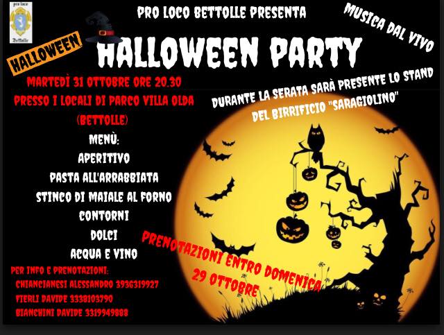 Martedì 31 ottobre 2017 Party di Halloween, ore 20.30, organizzato dalla Pro Loco Bettolle presso i locali di Villa Olda a Bettolle.