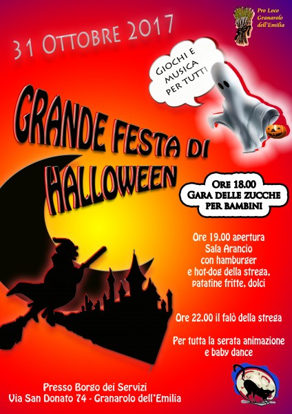 31 ottobre 2017 Festa organizzata dalla Pro-Loco Granarolo con gara delle zucche alle ore 18, dalle ore 19 apertura Sala Arancio con hamburger, hot-dog e patatine e dolci.