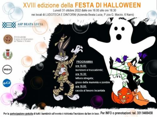 In occasione di Halloween 2022 il servizio “Ludoteca e...dintorni”, promosso dall’Azienda Pubblica di Servizi alla Persona Beata Lucia, organizza per giovedì 31 ottobre dalle ore 16,00 alle ore 18,30 presso i locali di Piazza Galeotto Marzio, la edizione della FESTA DI HALLOWEEN. Lo staff della Ludoteca proporrà, all’interno degli spazi dell’Azienda Beata Lucia, a partire dalle 16,00, un fantastico truccabimbi a tema, poi alle ore 17,00 una “lettura stregata”, ovvero un racconto da...brividi per bambini e bambine a partire dai 3 anni di età, e infine, dalle ore 18,00, un’originale e avvincente caccia al tesoro.