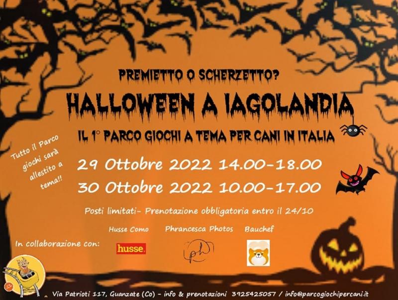 Il parco, che resta aperto tutto l’anno, nel fine settimana di sabato 29 e domenica 30 ottobre ospiterà l’evento tematico “Halloween a Iagolandia”. Nei 3.000 metri quadri del parco divertimenti sarà allestito un set fotografico in stile cimitero dove tutti i cani e i padroni potranno farsi ritrarre dalla pet photographer Francesca Cretella. Passeggiando per il parco umani e 4 zampe potranno assaggiare cioccolati e caramelle, come comanda la tradizione di Halloween, scattare tante foto divertenti e “mostruose” nei punti selfie, giocare in sicurezza nelle aree tematiche, scoprire i gadget di Husse Italia e assaggiare gli snack artigianali e naturali per cani di Bauchef di Serena Piva.