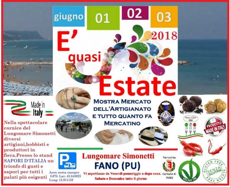 Apriamo l'estate a Fano come ogni anno torna la manifestazione artigianale sul lungomare 1/2/3 GIUGNO 2018 ''E' QUASI ESTATE'' mercato artigianale tra hobbisti creatori e poduttori animeranno la passeggiata piu' bella della cittadina marchigiana. Dalle 10.00 alle 23 vi aspetteremo per una degustazione di specialità gastronomiche, dal tartufo umbro al piccantssimo calabrese. Aree free camping, sconti per camperisti e per celiaci.