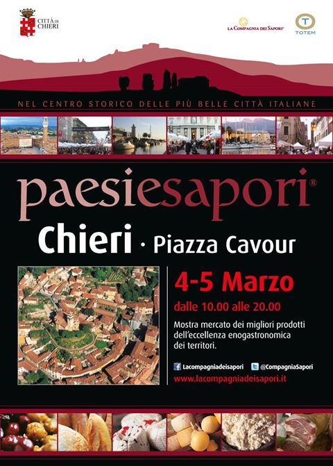 Arriva a Chieri Paesi e Sapori, mostra mercato che sabato 4 e domenica 5 marzo, dalle ore 10.00 alle 20.00, porterà in Piazza Cavour una raffinata selezione di specialità della tradizione enogastronomica italiana.
