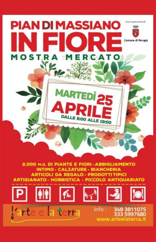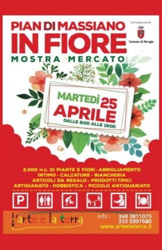 Torna Pian di Massiano in Fiore, organizzato dall'Ass. "L'arte e la Terra", si svolge il 25 Aprile 2023 a Pian di Massiano, località di Perugia, la mostra mercato con prodotti alimentari e non alimentari, prodotti tipici, artigianato e prodotti vari.