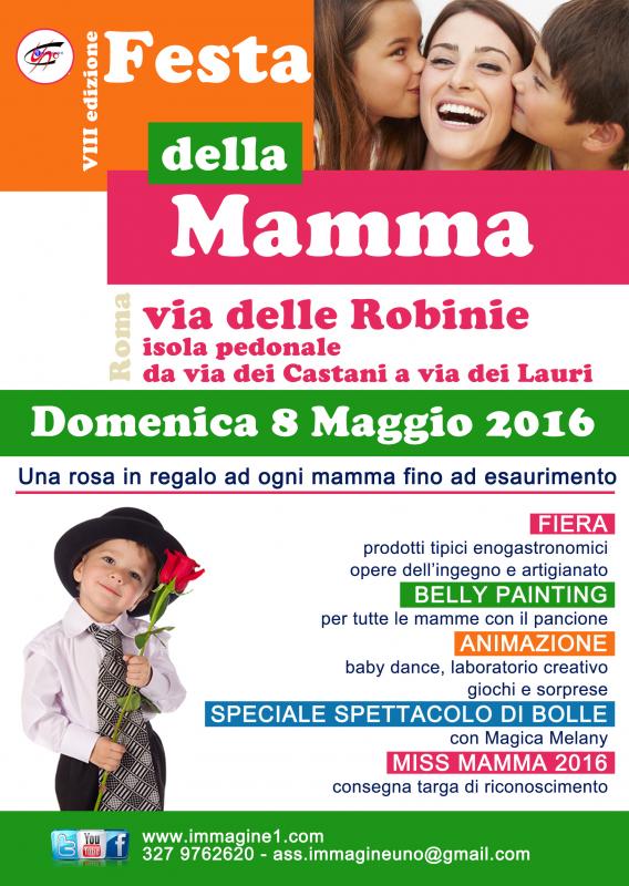 Domenica 8 maggio 2016 a Roma, in via delle Robinie nell’isola pedonale tra via dei Castani a via dei Lauri, la Festa della Mamma profuma di primavera. Una rosa in regalo per ogni mamma, fino ad esaurimento e per le donne in dolce attesa un coloratissimo belly painting.