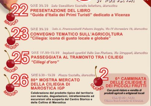 In primavera non può mancare la Mostra Mercato delle Ciliegie di Marostica IGP, che quest'anno il 26 Maggio raggiunge la 80a edizione, durante la quale si svolgono eventi divertenti, degustazioni, laboratori e molto altro.