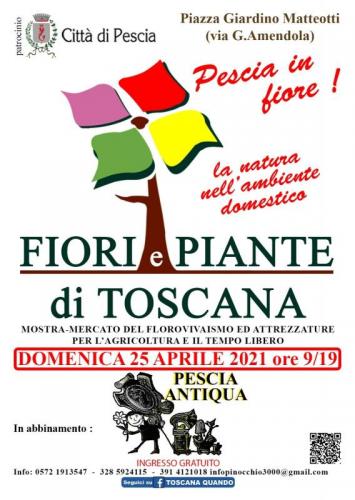 Come vuole la tradizione, anche per quest'anno l'appuntamento con Pescia Antiqua del 25 aprile sarà tra i più importanti di tutta la stagione. Negli anni scorsi, prima del covid 19, la città di Pescia veniva letteralmente invasa da tantissimi visitatori richiamati dall'abbinamento del mercato dell'antiquariato con Sarà banda!, sicuramente una rassegna delle street band più famose a livello nazionale. Per quest'anno, nel più scrupoloso rispetto delle attuali normative per il contenimento del diffondersi del virus, gli organizzatori di Pescia Antiqua e l'assessorato alle attività produttive del Comune, hanno pensato di abbinare alle bancarelle dell'antiquariato, dell'artigianato, del collezionismo e del vintage anche una bella esposizione di Fiori e piante di Toscana, individuando nei giardini di piazza Matteotti la sede più indicata per ospitarla, dando continuità alla manifestazione da sotto al palazzo Comunale fino alla grande fontana dei giardini, aumentandone la superficie per garantire il distanziamento e non creare assembramenti.
