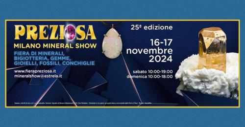 Sabato 16 e Domenica 17 Novembre 2024 al Parco Esposizioni Novegro: 25a edizione Preziosa, mostra mercato di minerali, bigiotteria, gemme, gioielleria, fossili, conchiglie.
